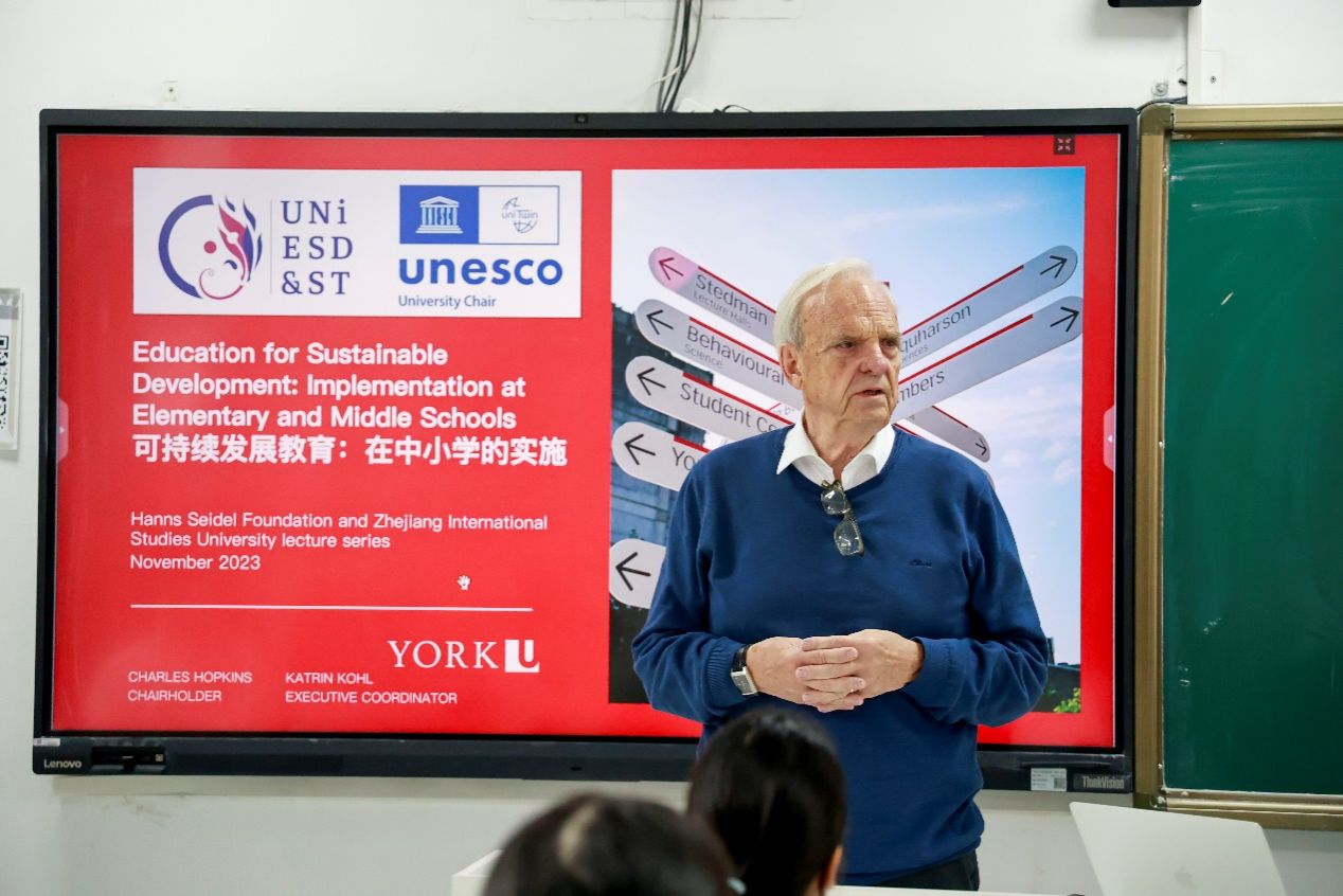 教育学院举办和山书咖系列活动 可持续发展教育:在中小学的实施 为推动教育高质量发展,从国际视角对话教育,培养具有国际视野和应变能力的卓越教师,教育学院联合德国汉斯·赛德尔基金会浙江代表处于2023年11月8日上午特邀加拿大多伦多约克大学Charles Hopkins教授和联合国教科文组织可持续发展教育教席的执行协调员和首席研究员Katrin Kohl就“可持续发展教育:在中小学的实施”作专题讲座。德国汉斯·赛德尔基金会浙江代表处负责人施小东、联合国可持续发展教育专业区域(杭州)中心主任吴卫东教授、学院副院长吴晓博士以及科教专业部分学生等参加了此次讲座。 本次讲座从非洲乍得湖在人类活动影响下逐渐变小的例子出发,分析了人类活动、气候变迁和环境变化之间的互动关系,分享了联合国可持续发展理念的由来和历史框架;并且从分析联合国2030年议程中的可持续发展目标(SDG),探讨了将可持续发展融入中小学教育的实用方法;最后,还讨论了如何将可持续发展概念纳入学校课程的战略和现实世界的案例,以培养有能力应对全球可持续发展挑战的下一代。 随后,参会师生进行积极互动,两位同学分享了各自设计和参与的科学活动,并提出了关于如何利用科学教育与可持续发展理念结合的一些设想和做法,其他老师也结合本次活动主题提出了一些有意义的问题。两位教授对以上问题进行了一一回应。 最后,与会者共同认可:科学可以在可持续发展扮演重要的角色;可持续发展可以创造更美好的未来;地球资源是为所有的生命,而不仅仅是为了人类(being more,not having more)。 供稿:教育学院 摄影:季康松 文字:陈伟伟