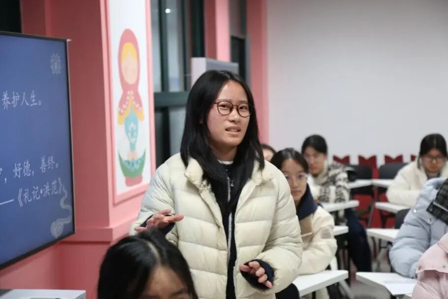 在提问交流环节,现场学生积极思考,围绕着《黄帝内经》中情绪对人身体影响的语句以及古人常说的“五福”概念等发表个人理解,陈丹老师针对同学们的想法做出相应补充,解释了古文的正确含义和其中蕴含的科学智慧,强调养生不仅是养护生命,更要养护人生。