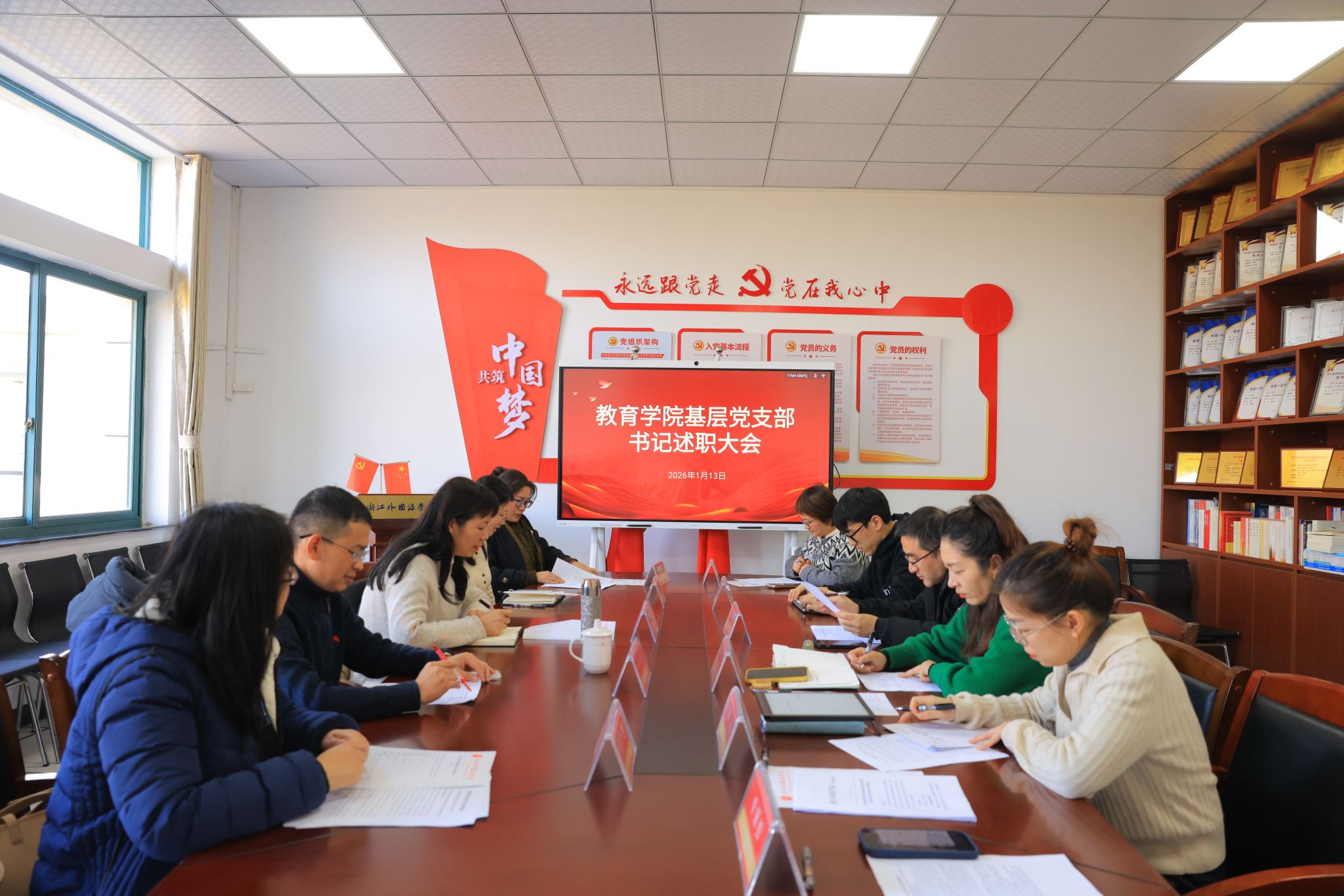 杨飞群书记对各位支部书记的述职逐一作出点评,充分肯定各党支部在过去一年取得的扎实成效与积极进展。她在总结讲话中指出,各党支部要以此次述职评议为契机,一要持续强化政治引领,坚守“党建引领是根与魂”的根本遵循,确保党的教育方针在学院落地生根、开花结果;二要着力推动党建工作与学院中心任务深度融合、同频共振,紧紧围绕师范生内涵发展,站在“国之大计、党之大计”的战略高度谋划推动工作;三要依托学院“12345”党建体系,持续做优“一支部一品牌”建设,不断增强支部工作的辨识度与党员的归属感,切实以高质量党建引领学院各项事业实现更高质量发展。