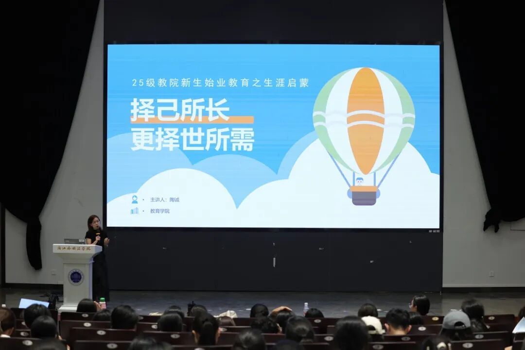 近日,教育学院面向2025级全体新生开展“适应·启航”生涯规划始业教育专题讲座。学工办主任陶诚老师聚焦“大学适应”与“生涯启航”两大核心主题,为新生们铺开大学生涯的成长蓝图。