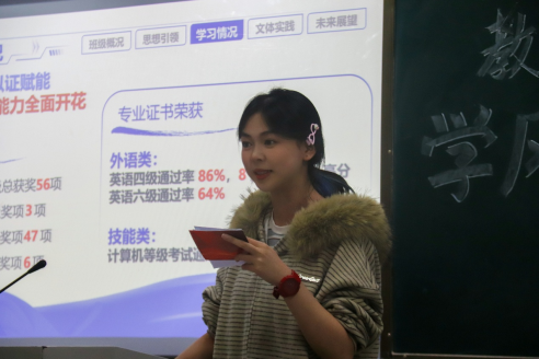 俞贝老师对本次活动进行了点评。她从现场表现,文本撰写、内容展示重点进行建议,并对在场的25级各班班委提出出了班级建设的建议与期望,希望各个班级向优秀榜样学习,知行合一,一起谱写教院荣光!