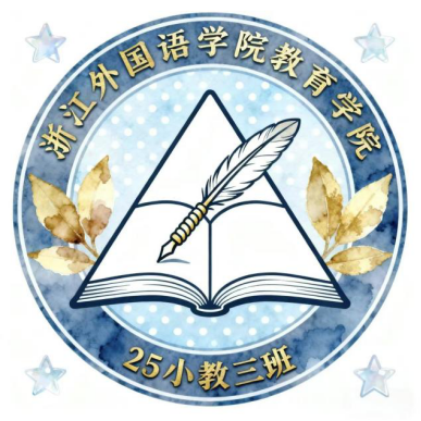 班级寓意和理念:中央图案为一本翻开的书,书页上放置一支羽毛笔,寓意教育与书写,体现小教专业的核心精神。书本两侧各点缀一片金色桂花叶,象征收获与温暖。整体设计融合了教育使命、专业特色与班级凝聚力,传递出25小教三班积极向上、追求卓越的精神风貌。