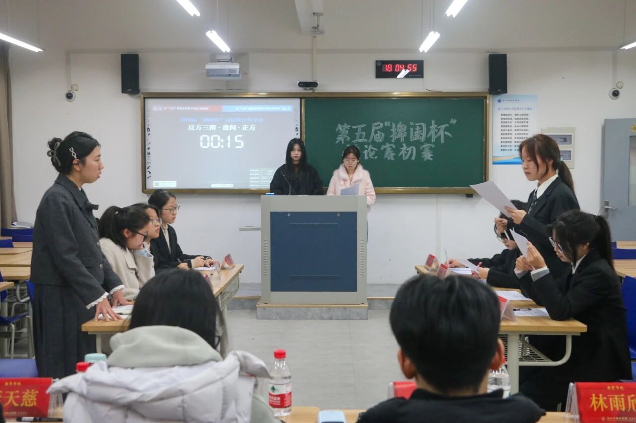 为锤炼教院学子思辨能力,促进学院间交流互鉴,教育学院携手国际商学院(“一带一路”涉外法治学院)共同举办第五届“捭阖杯”双院联合辩论赛。本次比赛特邀教育学院学生自律委员会指导老师俞贝、国商学院学生会指导老师陈体杰、浙江外国语第二十七届辩论赛亚军董晓羽,以及第十届“星火杯”新生赛季军翁若丹担任评委。从初赛激辩到复赛角逐,再到决赛争锋,一场场语言与逻辑的盛宴精彩上演。初赛赛场上,双方辩手围绕“对‘上岸’的执念有/不利于年轻人的成长”这一话题展开辩论。正方鲜明立论,指出上岸执念是经自我审视的目标,能为青年锚定方向、锤炼韧性,更是民族进取精神的体现,是成长的助力;反方犀利辩驳,认为上岸执念是过度偏执的想法,会窄化青年发展路径,还会催生恶性竞争,阻碍多元成长。双方辩手唇枪舌剑、互不相让,在激烈交锋中尽显风度,给评委与观众留下了深刻的印象。